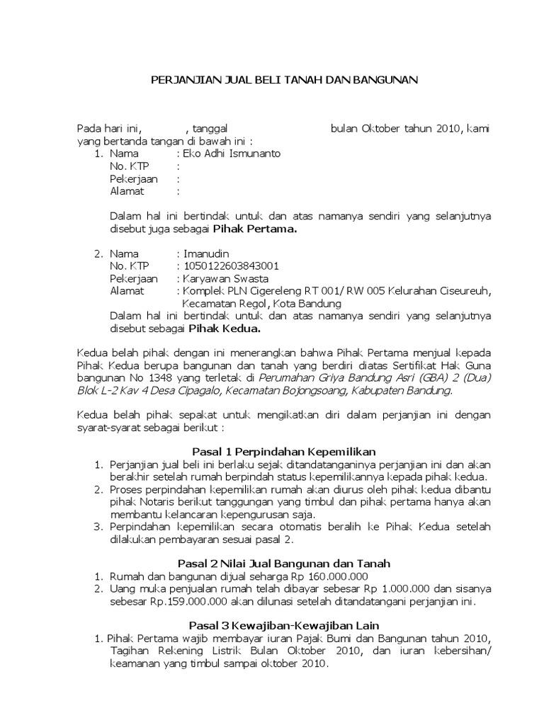 Contoh Surat Perjanjian Jual Beli Rumah Dengan Uang Muka Doc Content from i1.wp.com Surat perjanjian jual beli tanah. Surat perjanjian jual beli adalah surat yang dibuat oleh penjual dan pembeli yang berisi kesepakatan jual beli. Kedua belah pihak bersepakat untuk mengadakan ikatan perjanjian jual beli tanah dimana syarat dan ketentuannya diatur dalam 10 (sepuluh) pasal, seperti. Perjanjian jual beli tanah format. Fungsi surat perjanjian untuk menjelaskan kewajiban dan hak kedua belah pihak, kewajiban pembeli membayar uang kepada penjual, dan penjual berhak atas uang tersebut. Walaupun memungkinkan untuk tidak menggunakan sebagai salah satu contoh kecil adalah ketika anda ingin membeli sebidang tanah dari orang lain. Nah, khusus untuk jual beli demikian, tentu akan lebih baik jika anda menggunakan surat perjanjian. Penukaran nama hak milik di dalam geran akan di laksanakan dalam tempoh _ dari perjanjian ini di tandatangan , manakala.